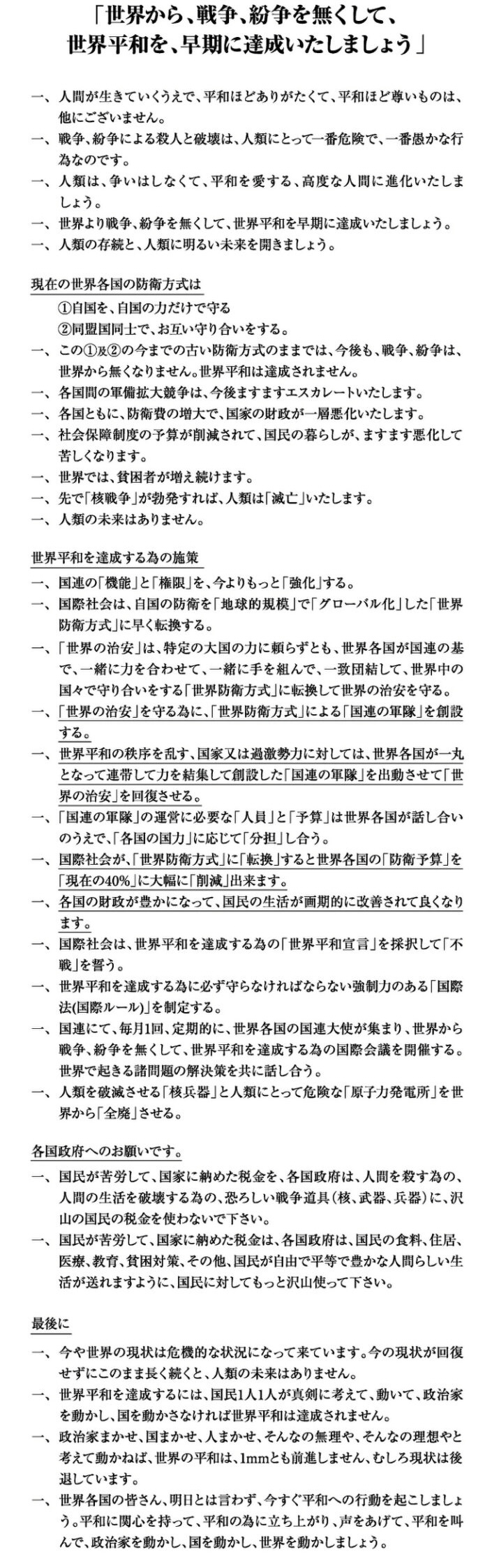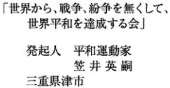 世界から、戦争、紛争を無くして、世界平和を早期に達成いたしましょう